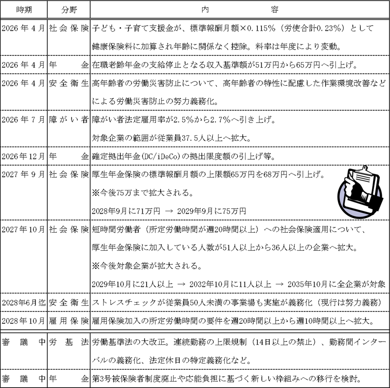 今後の労務に関する主な改正をざっと確認しましょう。
